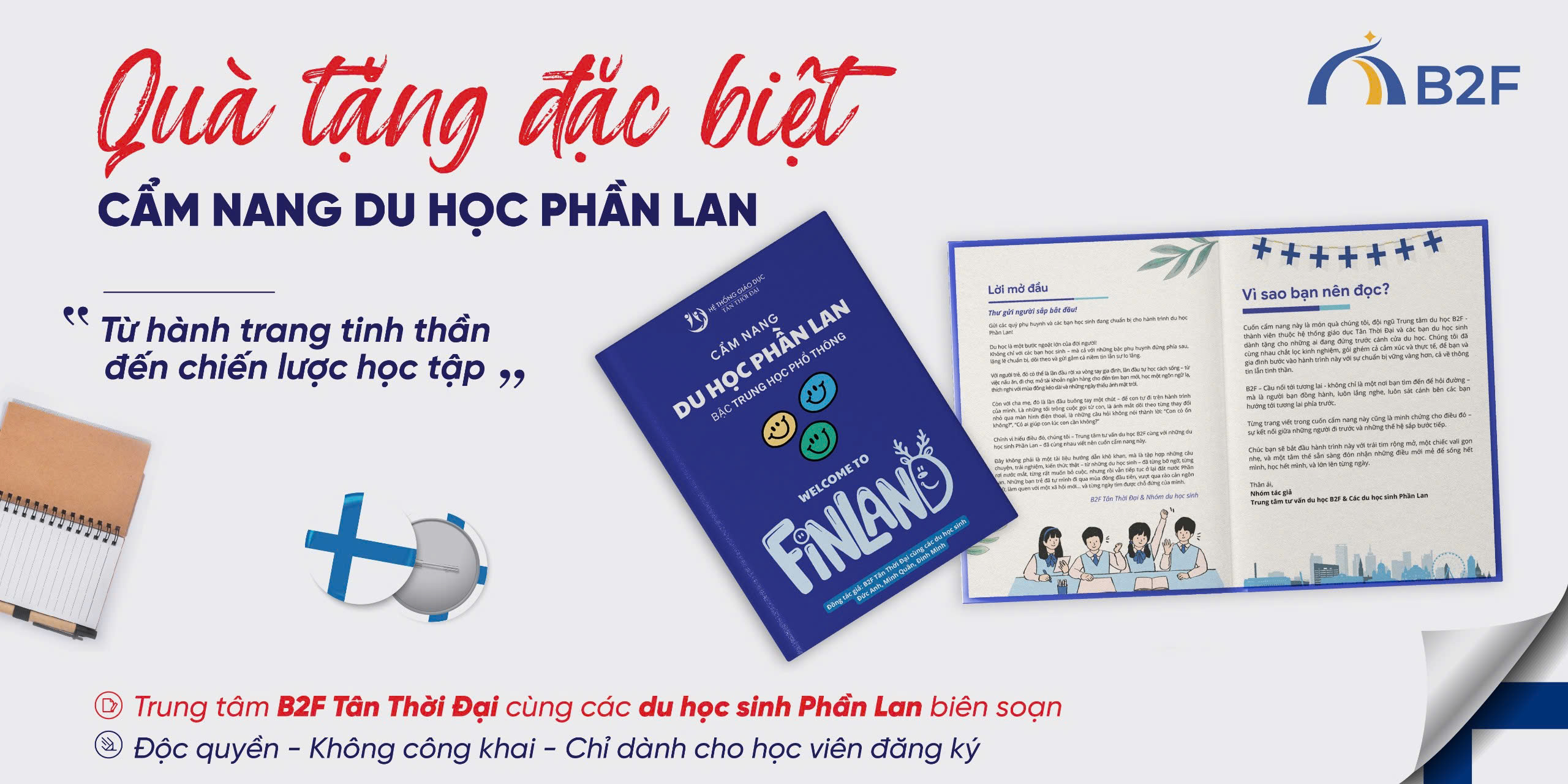 B2F tự hào hợp tác cùng các trường học, tổ chức giáo dục và đối tác uy tín tại Phần Lan và nhiều quốc gia khác. Mạng lưới đối tác được B2F lựa chọn kỹ lưỡng, đảm bảo chất lượng đào tạo, môi trường học tập an toàn và lộ trình học tập phù hợp cho học sinh Việt Nam. Sự đồng hành chặt chẽ giữa B2F và các đối tác quốc tế là nền tảng giúp học sinh được hỗ trợ xuyên suốt, từ tư vấn ban đầu đến quá trình học tập và sinh sống ở nước ngoài.